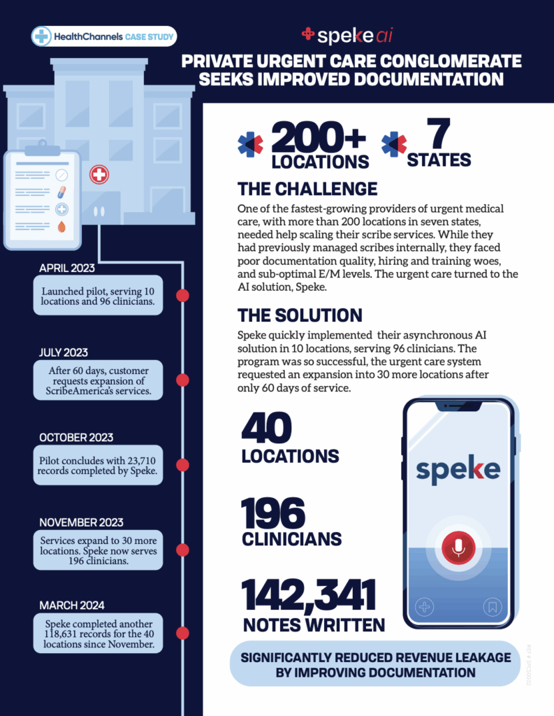 One of the fastest-growing providers of urgent medical care, with more than 200 locations in seven states, needed help scaling their scribe services. While they had previously managed scribes internally, they faced poor documentation quality, hiring and training woes, and sub-optimal E/M levels. The urgent care turned to the AI solution, Speke.