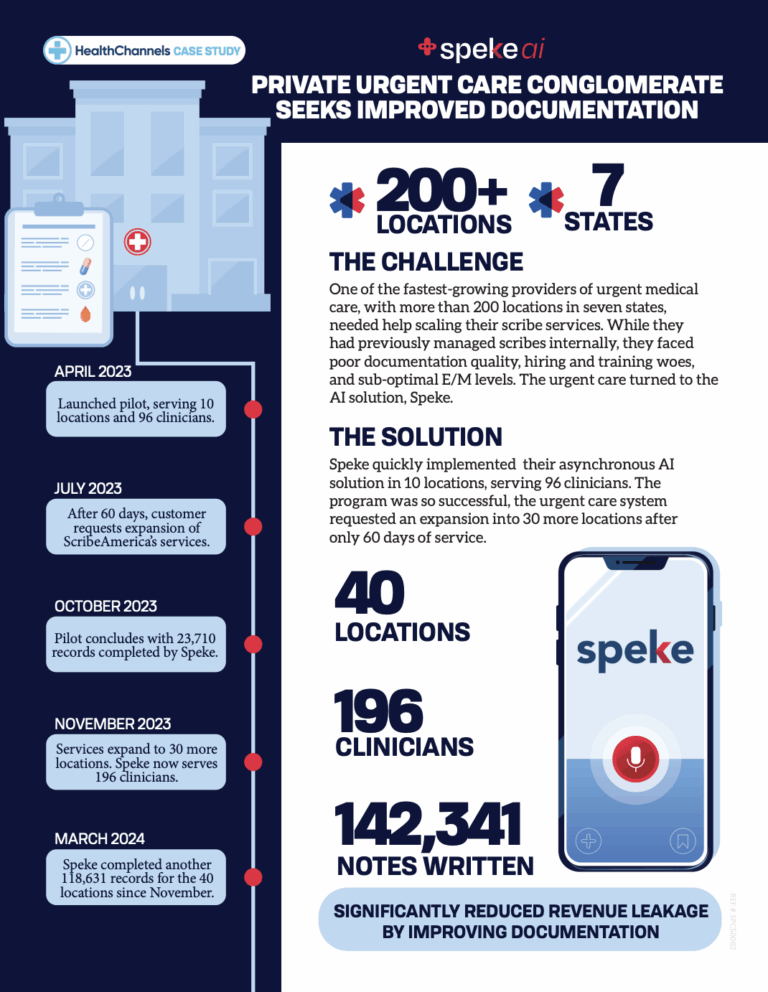 One of the fastest-growing providers of urgent medical care, with more than 200 locations in seven states, needed help scaling their scribe services. While they had previously managed scribes internally, they faced poor documentation quality, hiring and training woes, and sub-optimal E/M levels. The urgent care turned to the AI solution, Speke.