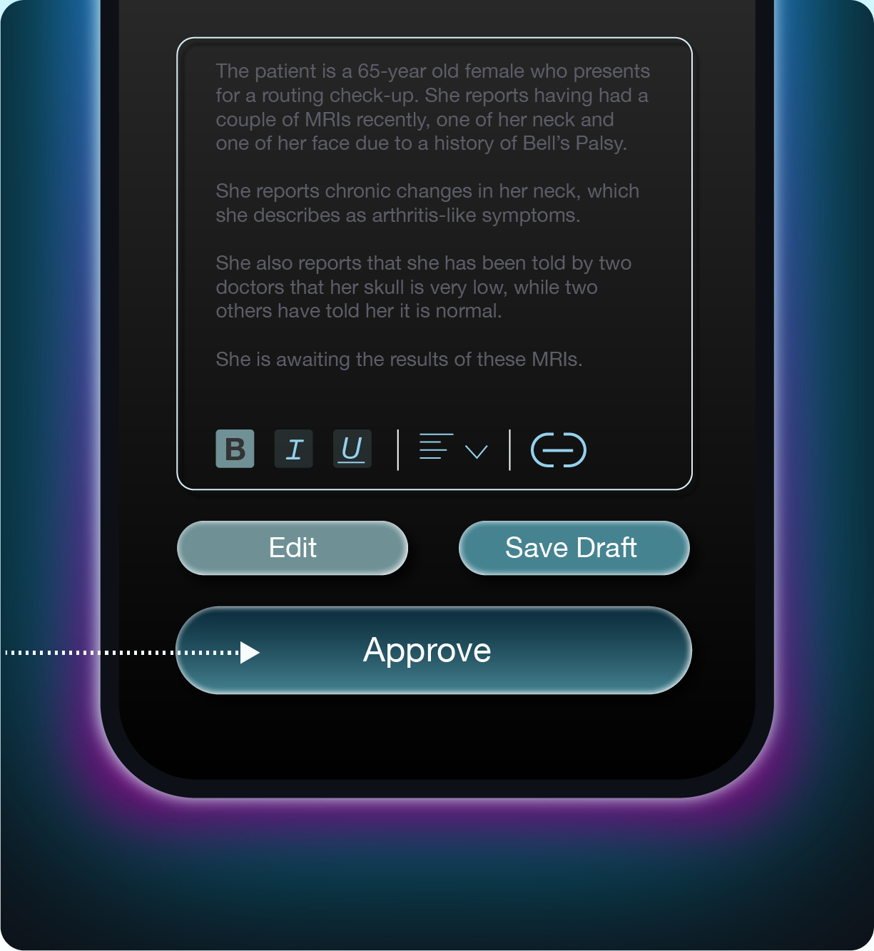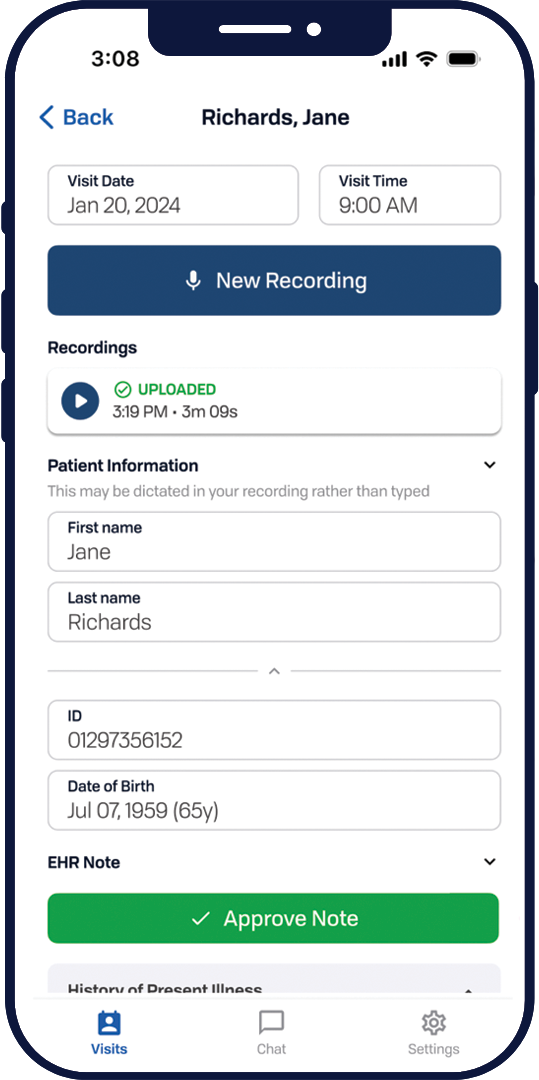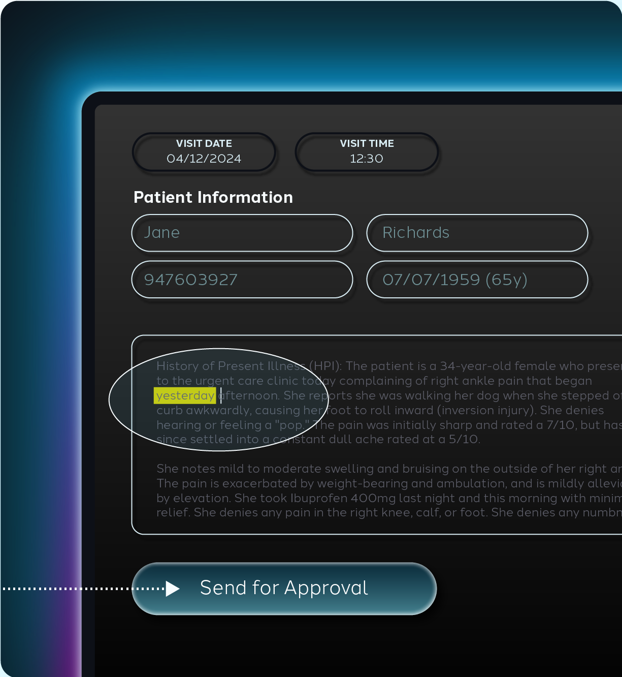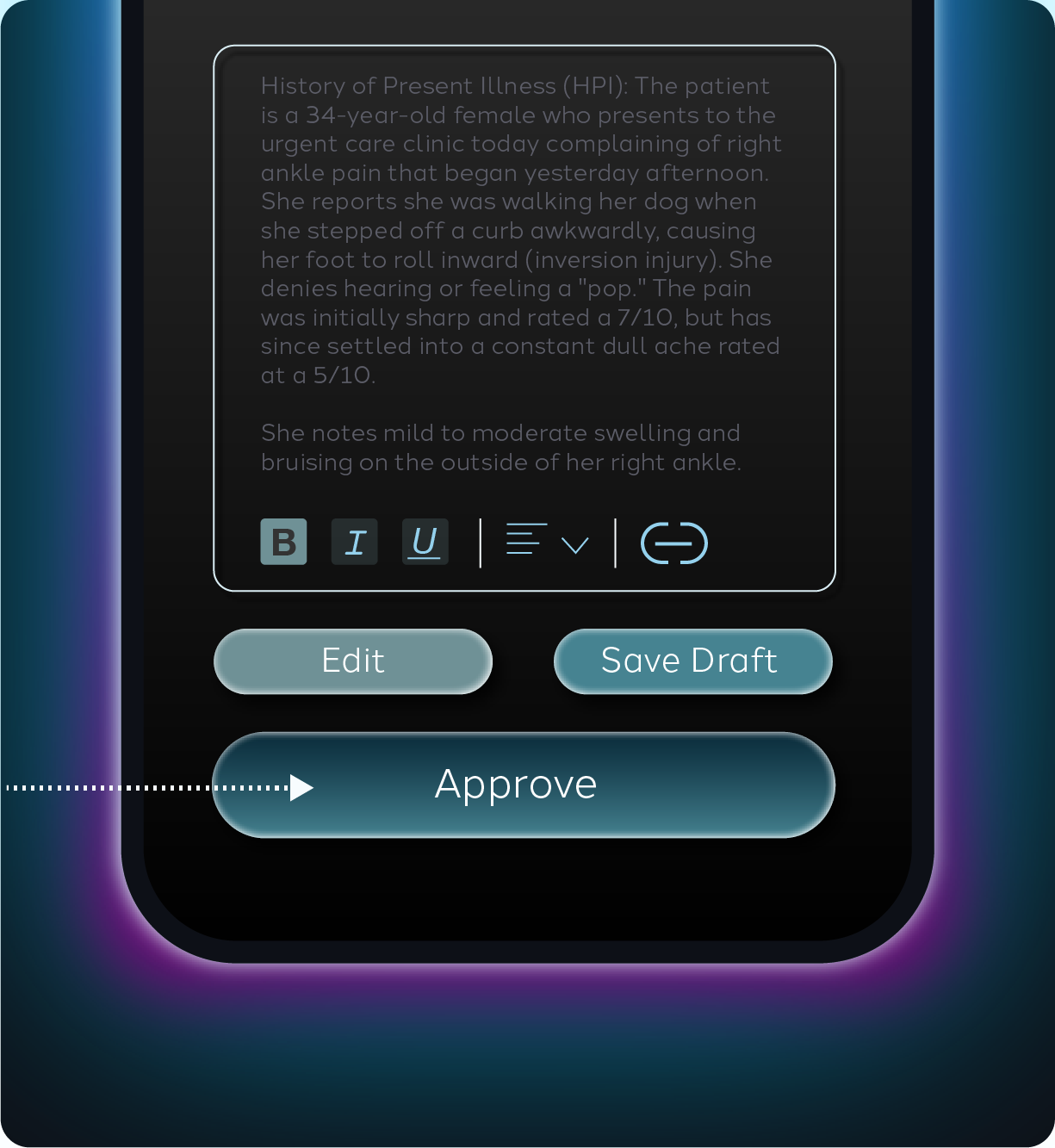 • 03 Final Say You can review completed notes and either approve the documentation or request edits. You can always ask questions or add clarifications. If more information is required, you can dictate notes with an additional recording. The note is not finalized until you’re satisfied.