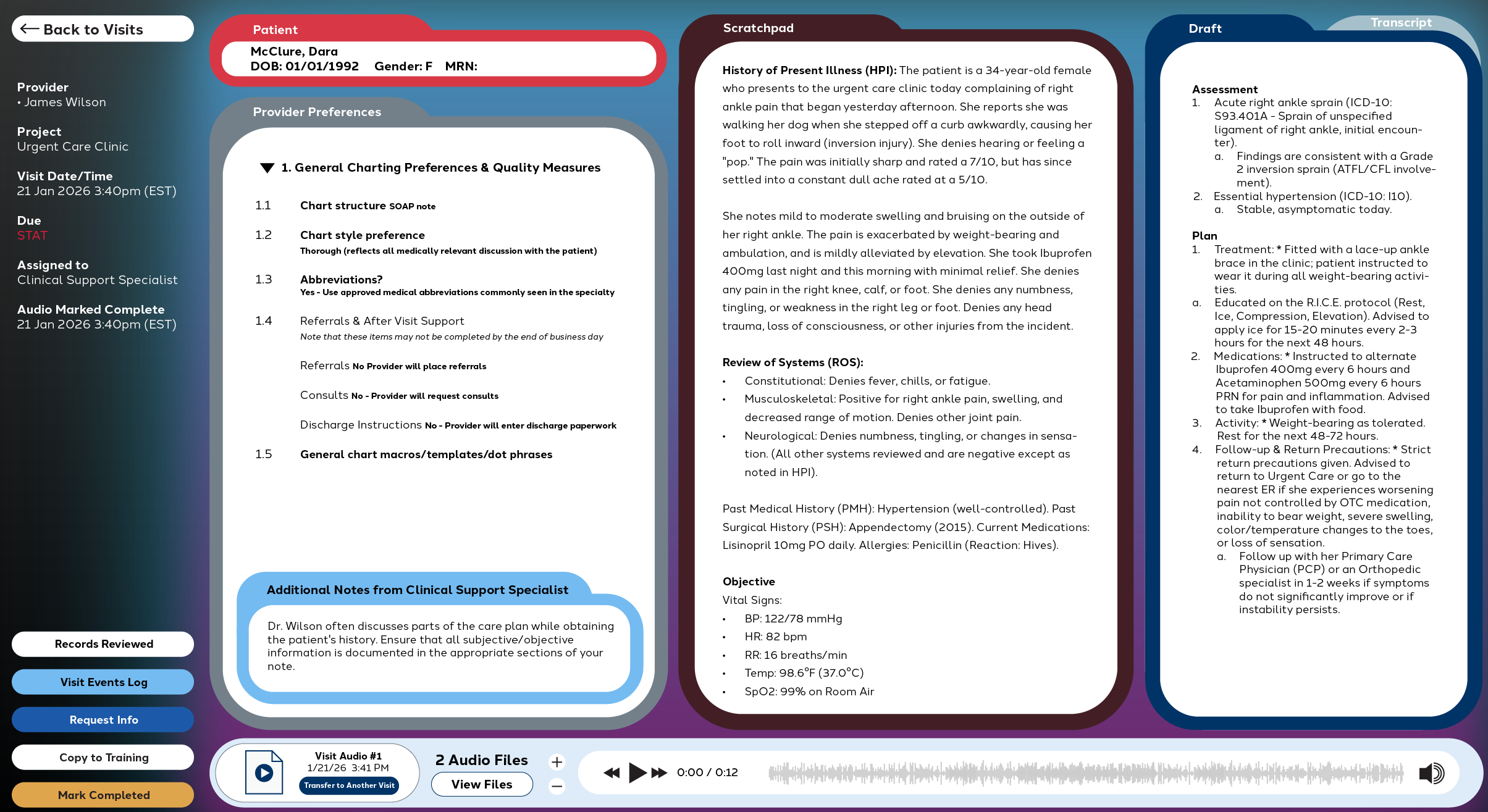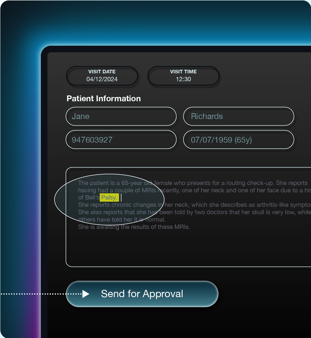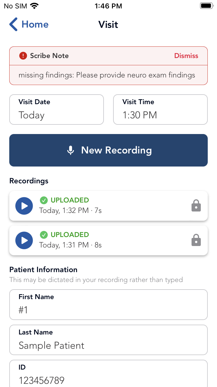 • 03 Final Say You can review completed notes and either approve the documentation or request edits. You can always ask questions or add clarifications. If more information is required, you can dictate notes with an additional recording. The note is not finalized until you’re satisfied.