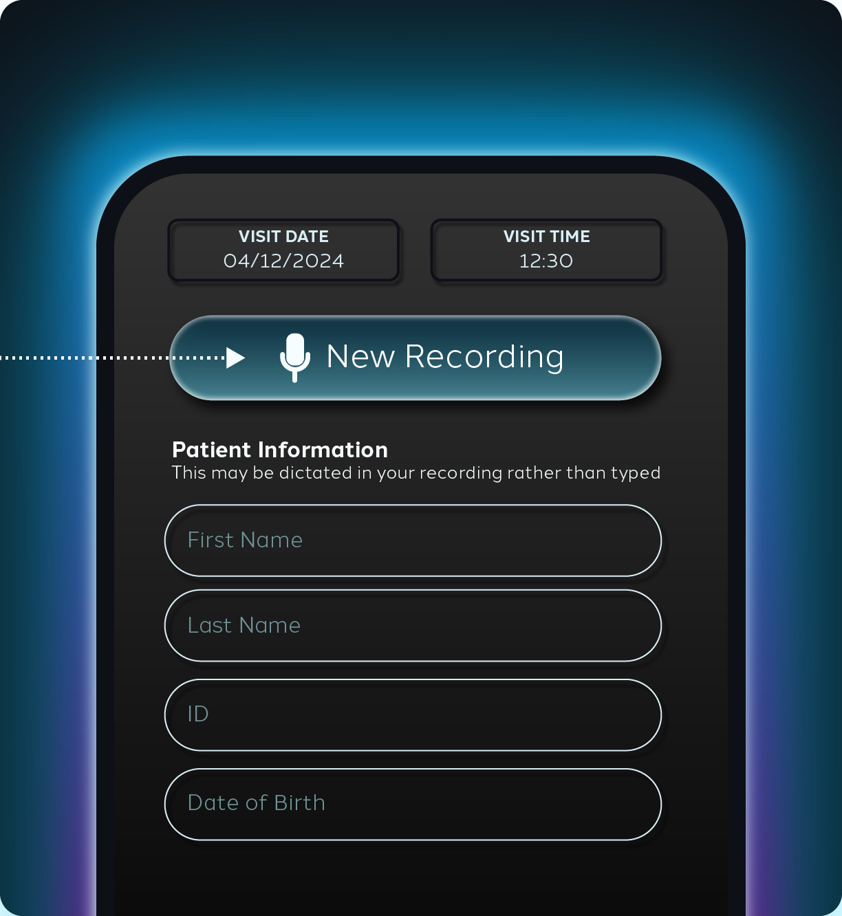• 01 Press Record Before beginning your encounter, press ‘Record’ in your Speke AI app. The AI will ambiently listen to your consultation while you proceed as normal. Simply select ‘Stop’ to end the recording and generate your note.